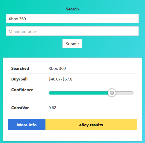 Searches an item on eBay, then Calculates some simple statistics for recently sold listings to determine good buy/sell prices. Uses fuzzy string comparison of listing titles to determine confidence that results match search term.